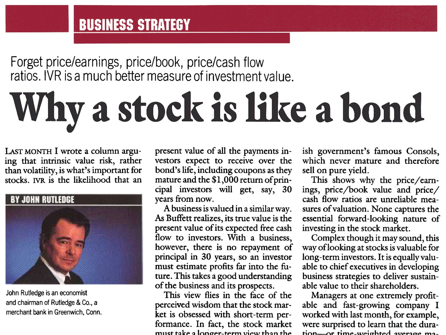 Summary: I wrote this piece for my Forbes column in 1994 to remind my readers that you own a stock for the same reason you own a bond—for its free cash flow. I used Coca-Cola for an example of the power of stock buybacks then. Today, you could write the same story about Apple. You can download a PDF file of the column by clicking on the image below or by clicking the following link. Download.
